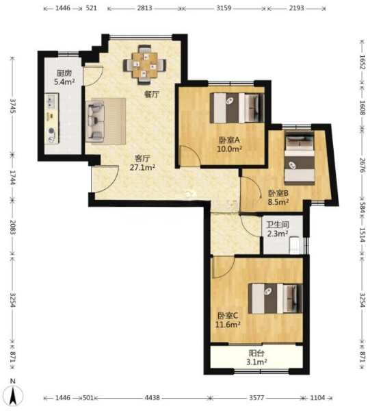 户型:3室2厅1卫